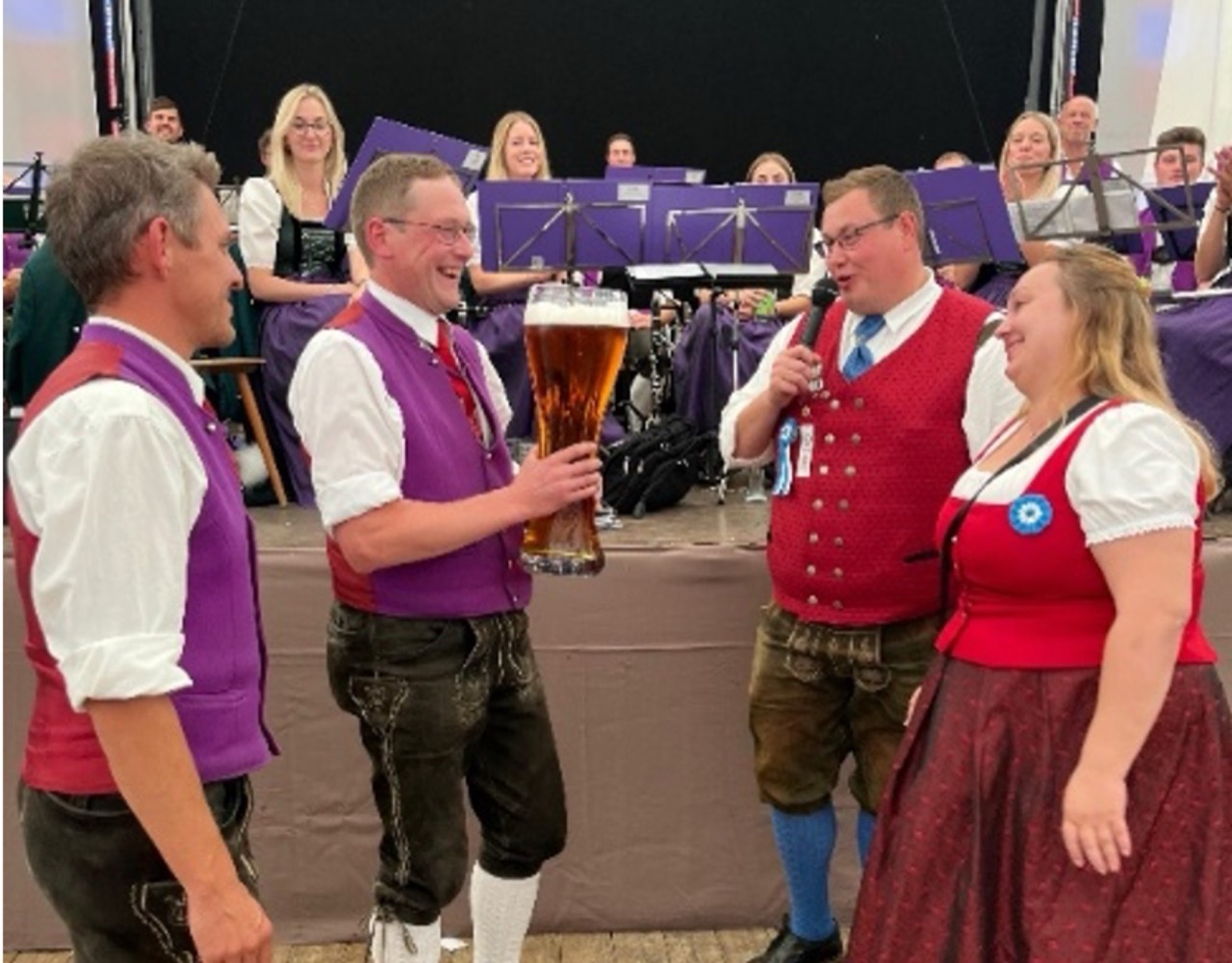 Vor dem Festakt durften wir im Zelt für gute Unterhaltung sorgen. Im Anschluss waren wir Teil des Sternmarsches und natürlich wurden auch Gastgeschenke ausgetauscht: Unser 5-Liter Bierglas wurde gebührend eingeweiht!